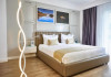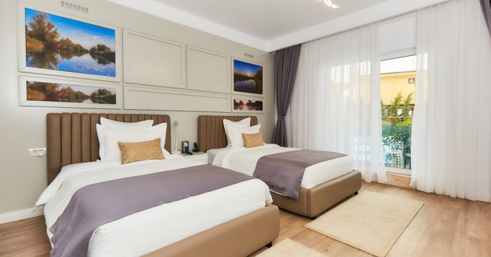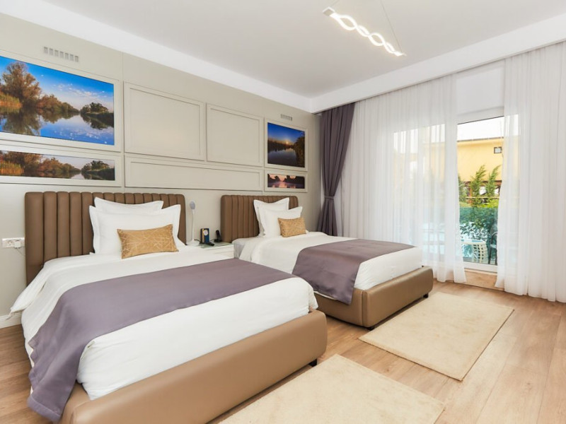 Two Bedroom Suite - 2 dormitoare, 34 mp Suita cu doua dormitoare la Lebada Luxury Resort & SPA ofera un refugiu de rafinament si confort, conceput pentru a asigura o sedere exceptionala. Acest tip de unitate de cazare include doua dormitoare spatioase, fiecare mobilat cu un pat king-size, cu asternuturi confortabile si decor elegant. Elementele de design contemporan, precum peretii cu lambriuri si corpurile de iluminat moderne, creeaza o atmosfera calma si sofisticata. De asemenea, suita dispune de o baie frumos proiectata cu finisaje din marmura, un dus spatios si facilitati de inalta calitate, adaugand un strop de opulenta rutinei zilnice. Oferind mai mult decat dormitoare spatioase, suita dispune de un spatiu vast de zi, asigurand confortul si functionalitatea necesara. Ideala pentru familii sau grupuri de pana la patru persoane, suita combina spatii private cu zone comune, perfecte pentru relaxare. Ferestrele largi permit un flux generos de lumina naturala, amplificand senzatia de spatiu si oferind vederi pitoresti asupra imprejurimilor naturale. Mobilierul sofisticat si atentia la detalii reflecta angajamentul resortului de a oferi o experienta fara griji tuturor vizitatorilor sai.