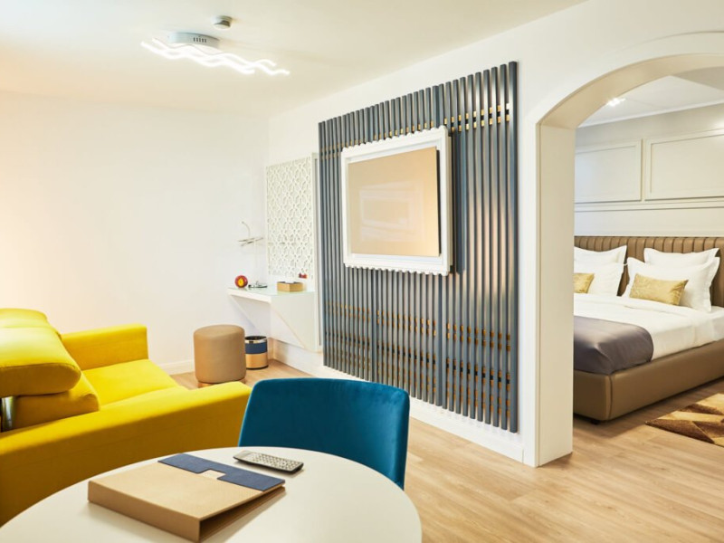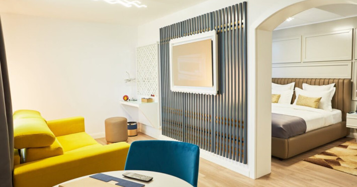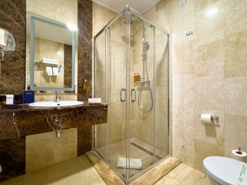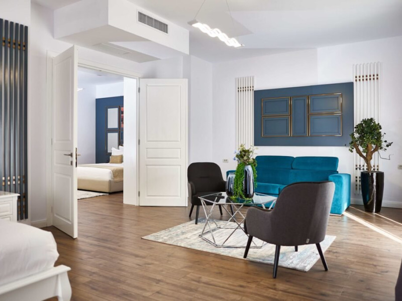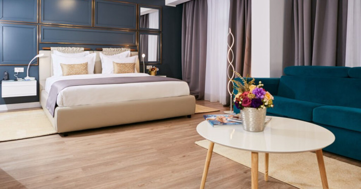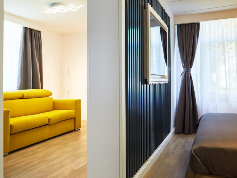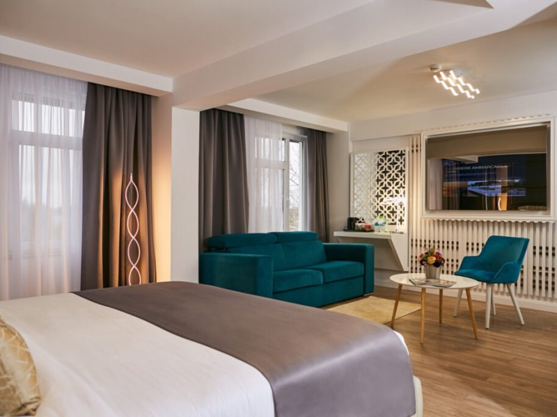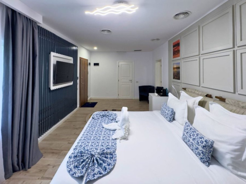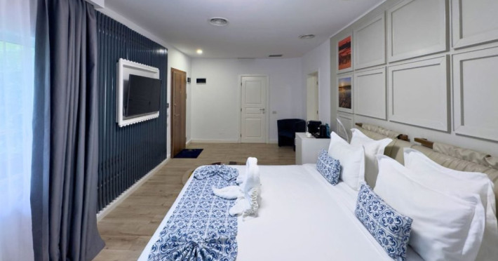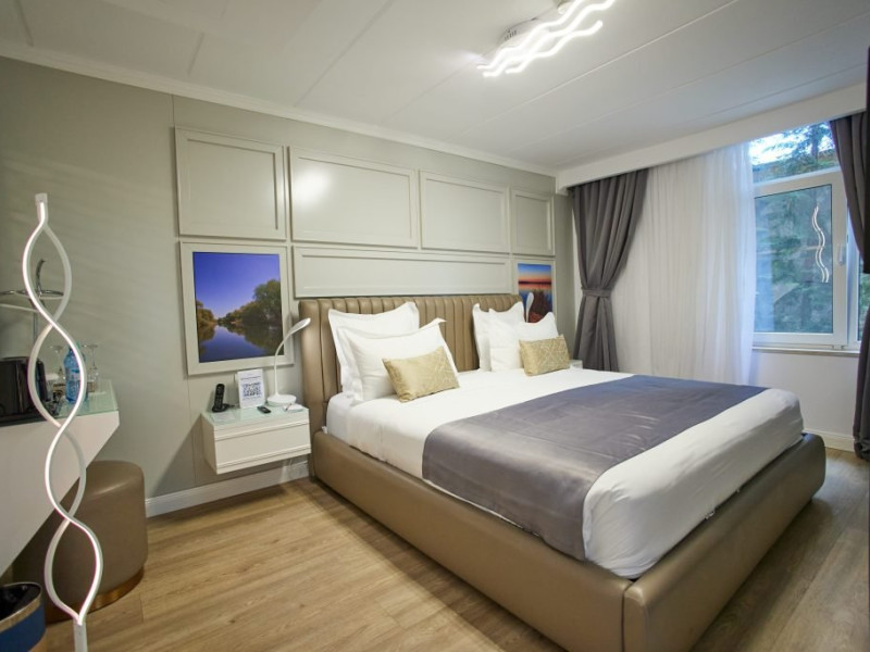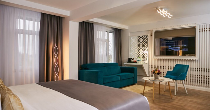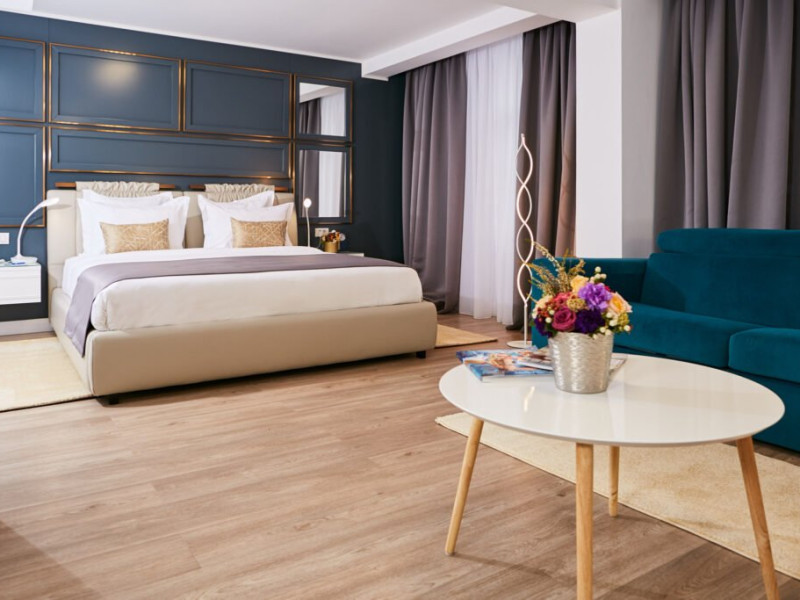 Junior Suite - pat kng size, canapea extensibila, 32 mp Suita Junior reprezinta alegerea ideala pentru familiile care cauta confort si eleganta. Aceasta include un pat king-size si o canapea extensibila confortabila, oferind spatiu generos pentru doi adulti si doi copii. Designul interior combina estetica moderna cu elemente primitoare, creand o atmosfera familiala. Suita este decorata cu iluminare ambientala si decor contemporan, generand o ambianta calma, perfecta pentru relaxare. Baia privata a Suitei Junior este dotata cu accesorii de inalta calitate si elemente elegante, oferind oaspetilor o experienta cu adevarat de 5 stele. Layout-ul spatios include o zona de toaleta cu o oglinda mare si iluminat sofisticat, amplificand confortul si comoditatea. Zona de zi, echipata cu o canapea vibranta, adauga un strop de culoare si o atmosfera vesela suitei. Suita ofera, de asemenea si un colt confortabil de relaxare, fiind ideala pentru sederi prelungite si creand cadrul perfect pentru destindere dupa o zi de explorare. Cu designul sau atent gandit, Suita Junior asigura o sedere memorabila la Lebada Luxury Resort & SPA.