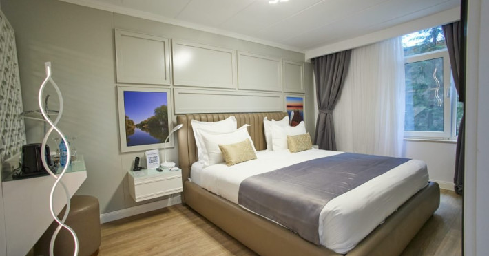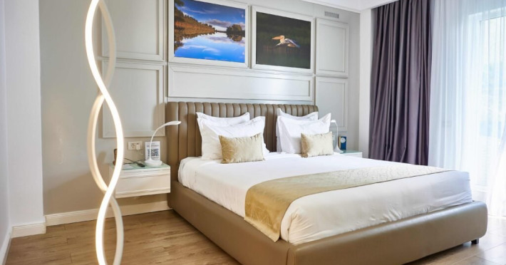 Camera King Room - vedere la gradina complexului, acces usor la centrul SPA, 16 mp Cand pasiti in camera Double King, veti fi intampinati de eleganta primitoare a unui pat dublu king-size spatios, care promite somn odihnitor invelit in lenjerie fina. Camera este proiectata pentru a fi un paradis al confortului, unde fiecare element este ales pentru a crea un sentiment de relaxare. Una dintre cele mai incantatoare caracteristici ale camerei este vederea sa asupra gradinilor bogate ale resortului. Ferestrele asigura ca frumusetea naturii nu este niciodata pierduta din vedere, creand o conexiune armonioasa cu imprejurimile inverzite ale complexului. Proiectata avand in vedere atat eleganta, cat si confortul, camera Double King este mai mult decat un simplu spatiu de cazare - este un spatiu in care confortul intalneste natura, unde fiecare zi incepe cu o priveliste a gradinilor si cu promisiunea unor experiente de neuitat la Lebada Luxury Resort & SPA.