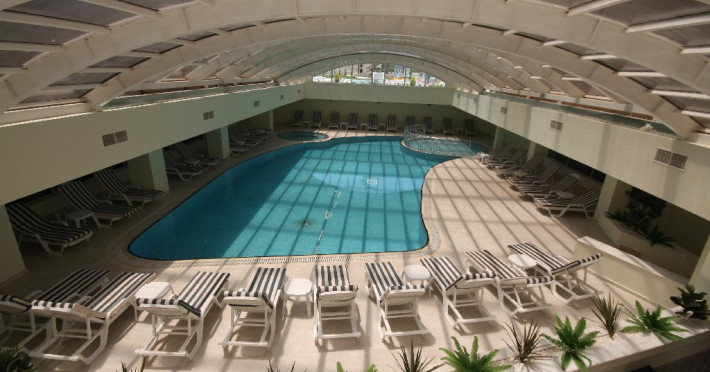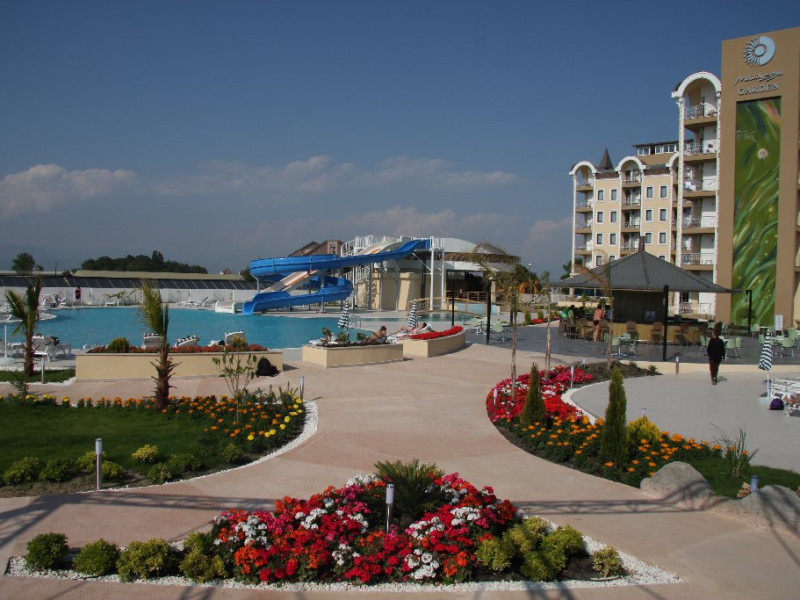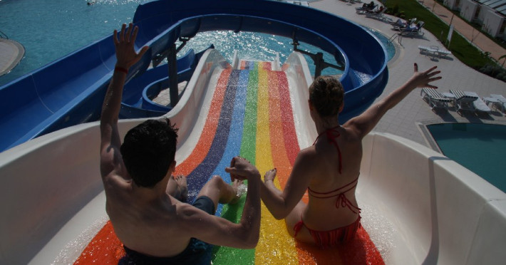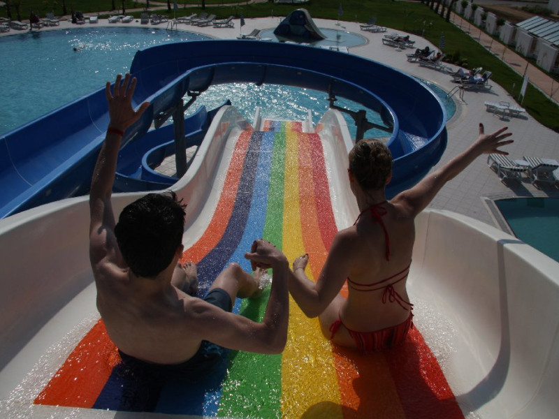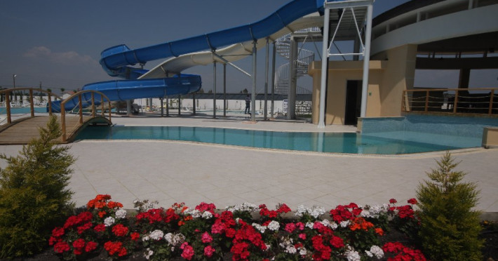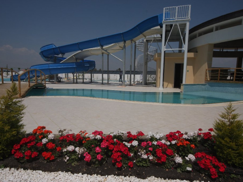 - Piscine:pisicina principala cu 2 topogane (230 mp), piscina secundara (110 mp), piscina