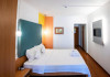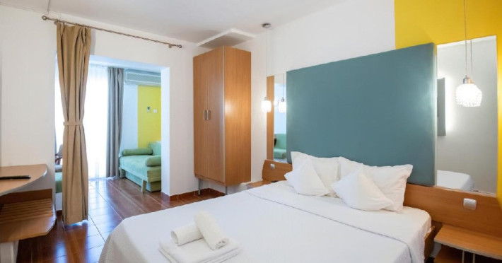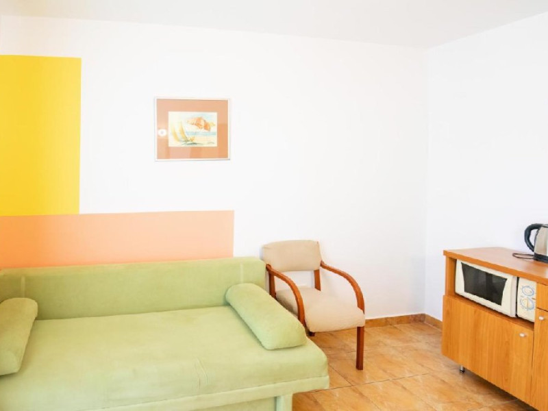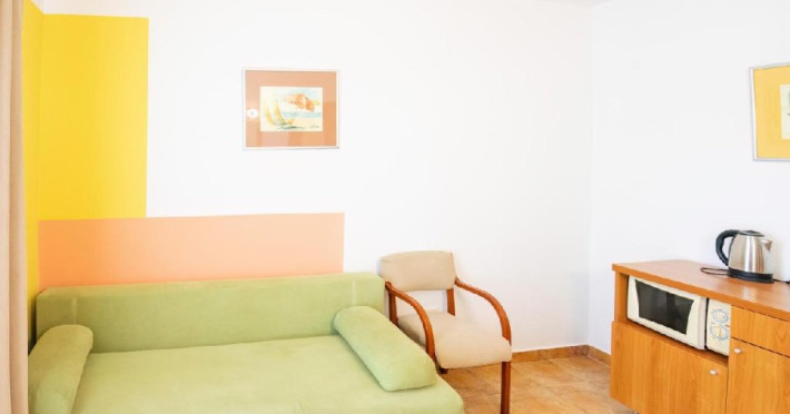 Apartament superior vedere panoramica - au living si dormitor, pat matrimonial si canapea extensibila, cu usa intre cele doua spatii, balcon, televizor in fiecare camera, internet, o baie, aer conditionat in fiecare camera, si racitor. Livingul are o vedere panoramica, superba, catre mare. Capacitate maxima: 4 adulti sau 3 adulti sau 2 adulti + 1 copil max 18 ani sau 2 adulti + 2 copii (0-17.99 ani).