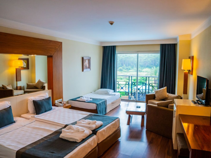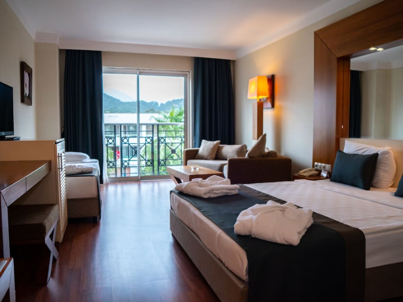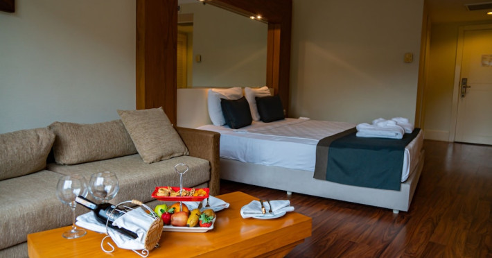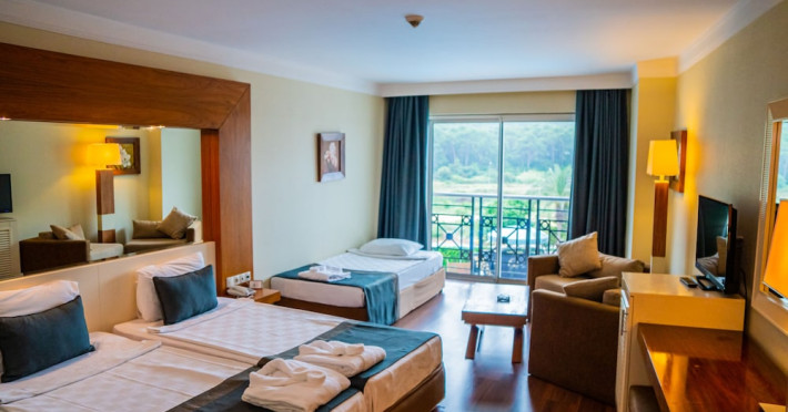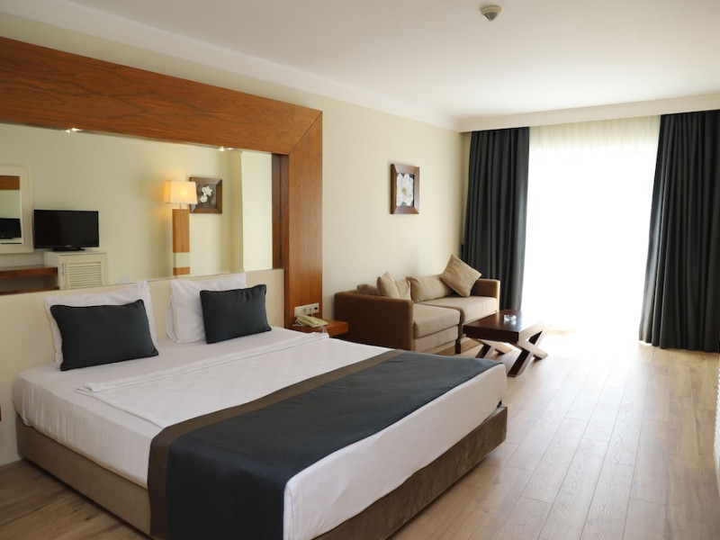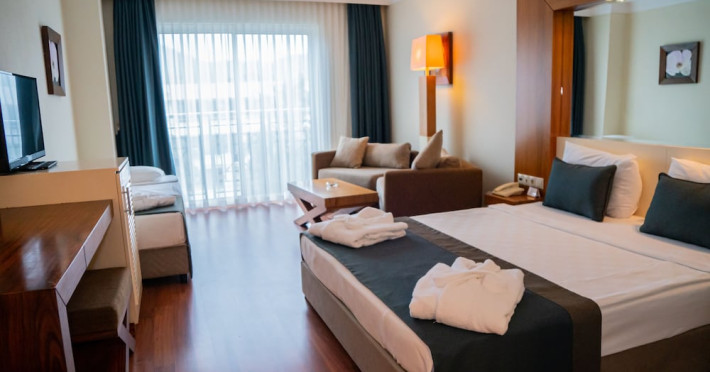 FACILITATI CAMERE:toate camerele sunt dotate cu : aer conditionat individual, telefon, acces internet wireless, TV, minibar, baie cu cabina de dus si uscator de par,seif,balcon/terasa. Camerele standard bungalow au in jur de 22 mp si dispun de balcon, cele superioare au 45 mp si au 2 bai, camerele family ( cladirea principala ) au in jur de 40 mp si au balcon, camerele swim up ( au peste 50 mp ) si dispun de terasa.Baby cot - se acorda gratuit - la cerere pentru toate tipurile de camera.