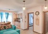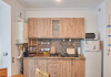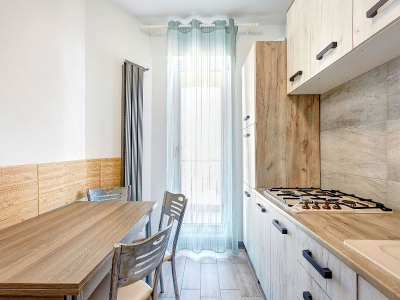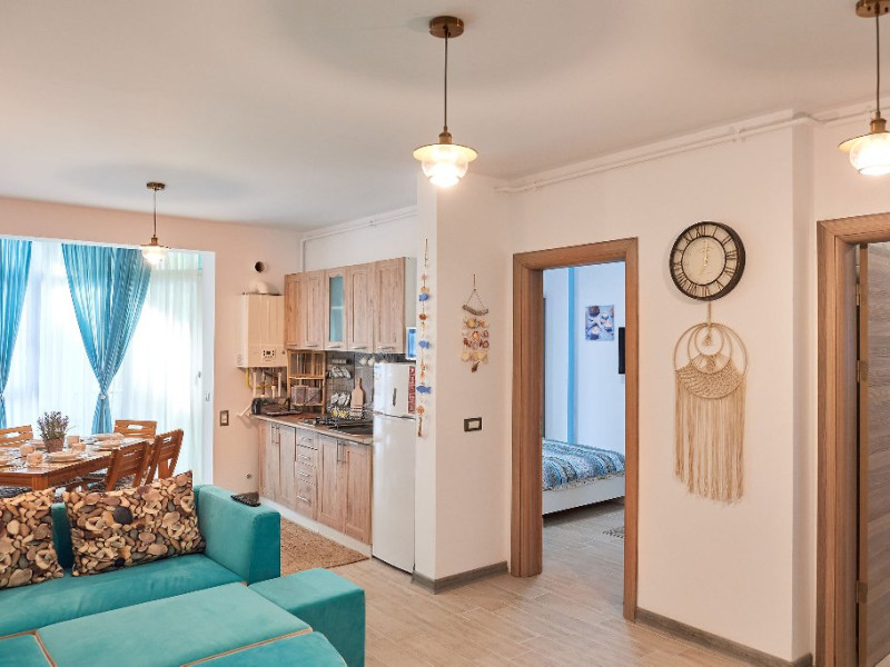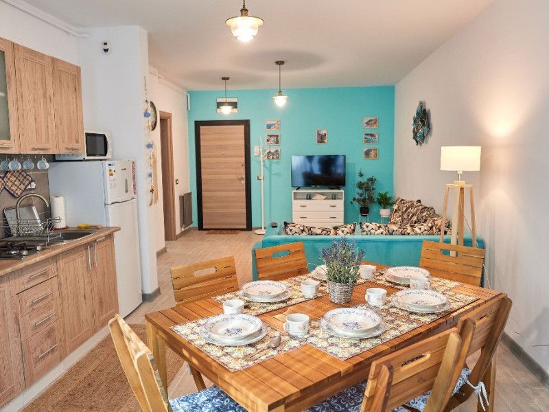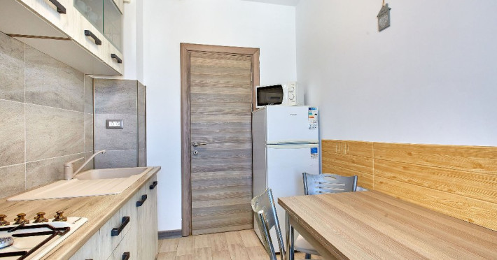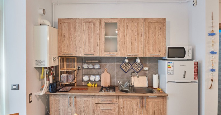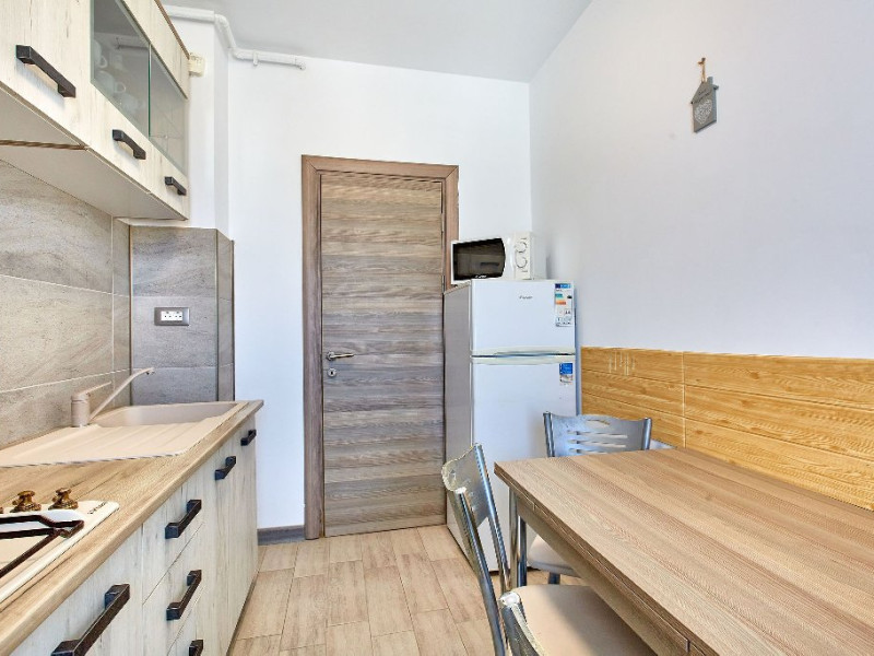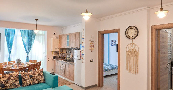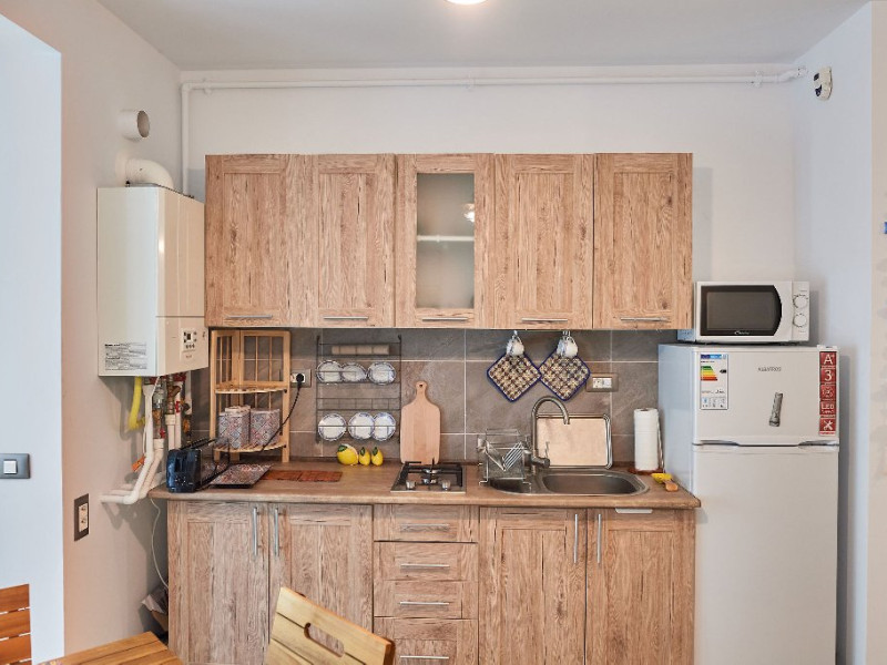 Bucatarie: Zona de gatit este definita de mobilierul din lemn intr-o culoare deschisa, care adauga o nota calda si naturala incaperii. Bucataria este echipata cu toate dotarile moderne esentiale pentru a satisface nevoile culinare. Masa, insotita de scaune in stil rustic, creeaza un spatiu primitor pentru mese si adunari. Dotarile includ, printre altele, un frigider spatios, un cuptor cu microunde modern si o plita eficienta.