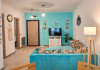 In apartamentul Complex din complexul Alezzi, sufrageria impresioneaza prin designul sau modern si spatios. O canapea mare, extensibila, in nuante vibrante de albastru aprins, domina aceasta zona, invitand la relaxare si vizionarea programelor preferate pe televizorul amplasat strategic pe un mobilier elegant. Luminozitatea si aerisirea spatiului sunt accentuate de culorile alese, iar designul este completat de decoratiunile si detaliile de pe perete.
