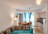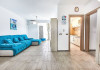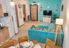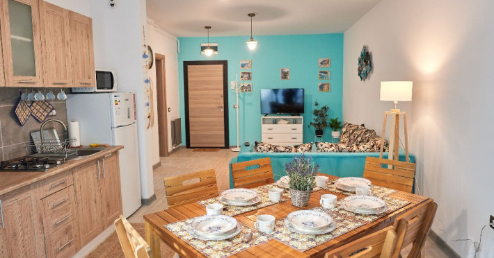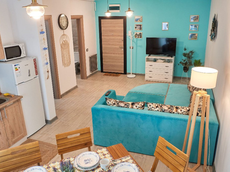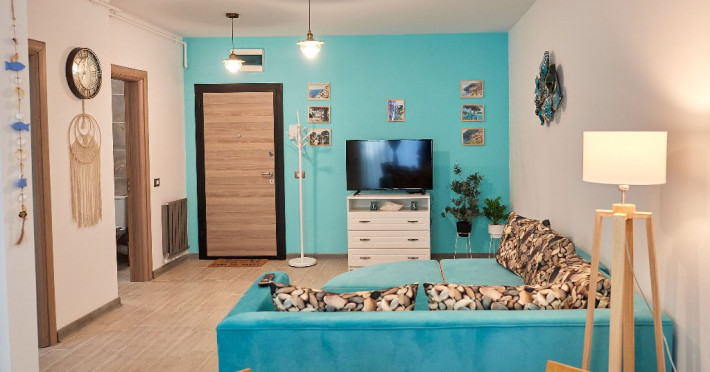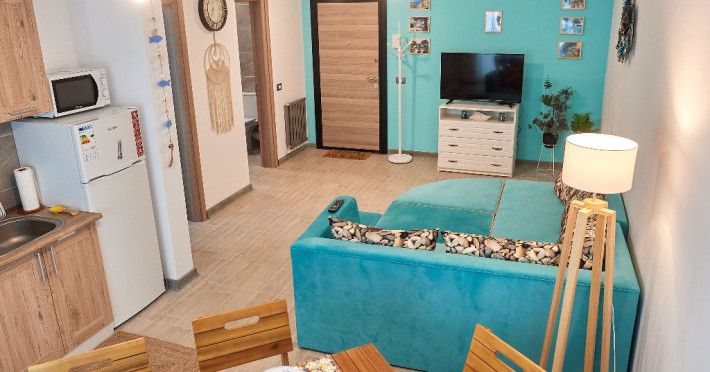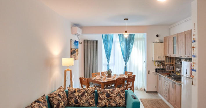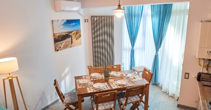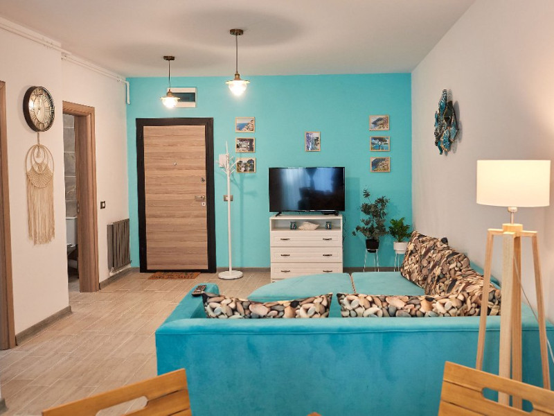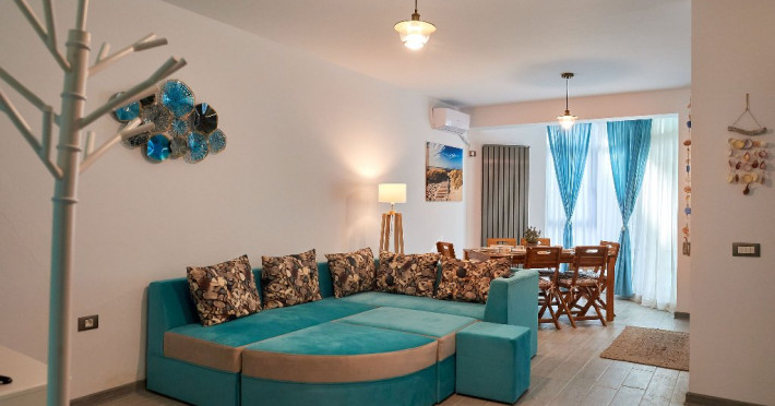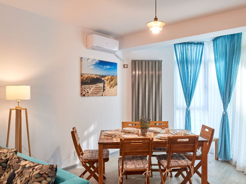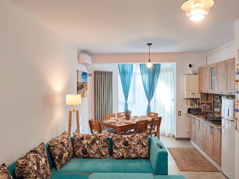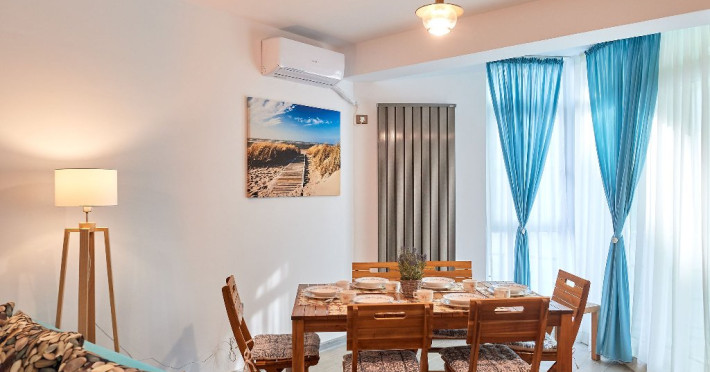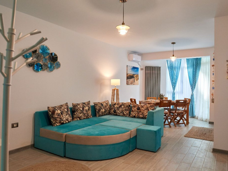 - Sufragerie: Sufrageria open space din apartamentul Coral emana o atmosfera primitoare si aerisita. Canapeaua extensibila este nu doar un punct focal estetic, dar si o invitatie la relaxare si confort. Spatiul este completat de detaliile decorative si accentele luminoase care imbogatesc ambianta. De asmenea veti gasi un TV cu ecran plat ce ofera o gama variata de posturi.