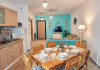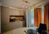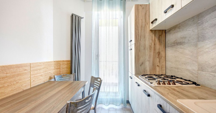 Bucataria, desi separata, pastreaza linia moderna a apartamentului. Este dotata cu toate electrocasnicele necesare pentru o gatit usor si placut. Mobilierul este atent ales, oferind suficient spatiu de depozitare. Zona de dining se compune dintr-o masa moderna, lipita de perete, cu scaune confortabile, oferind un cadru intim pentru mesele in familie.