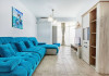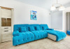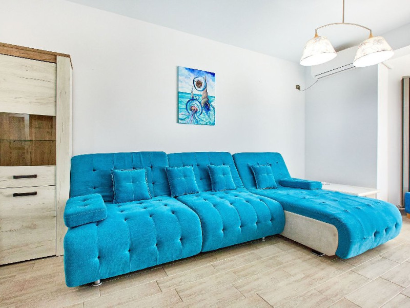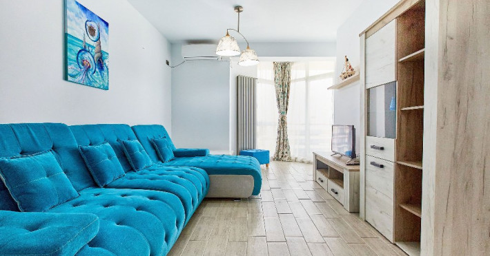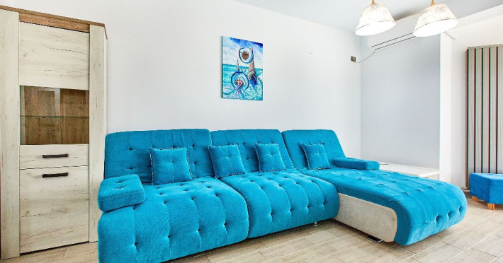 - Sufragerie Open-Space: Centrul acestei camere este canapeaua generoasa, albastra, extensibila, care emana o senzatie de confort si invitatie la relaxare. Contrasteaza armonios cu tonurile neutre ale camerei si aduce un plus de culoare si dinamism.