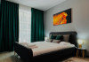 Dormitorul emana o atmosfera de liniste si relaxare. Patul matrimonial, confortabil, este accentuat de draperiile albastre, care adauga un plus de eleganta si rafinament. Televizorul montat pe perete, in fata patului, ofera posibilitatea de a te bucura de emisiunile preferate direct din confortul patului. Un dressing generos completeaza aceasta incapere, oferind tot spatiul necesar pentru depozitarea garderobei.