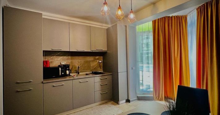 Bucatarie: Bucataria este dotata cu toate utilitatile moderne necesare pentru a pregati si servi mesele. Finisajele de calitate si mobilierul bine gandit imbina functionalitatea cu designul.Aceasta dispune de aragaz , cuptor cu microunde , frigider. Alaturi de zona de gatit, o masa de luat masa se aseaza strategic, fiind locul perfect pentru a savura preparatele culinare.